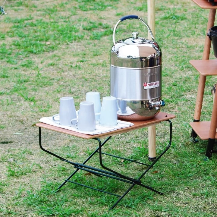 焚き火をしながらサイドテーブルとして使用するために設計されたアイテムだが、そのサイズからウォータージャグやクーラーボックスなどのスタンドとしても使用可能。